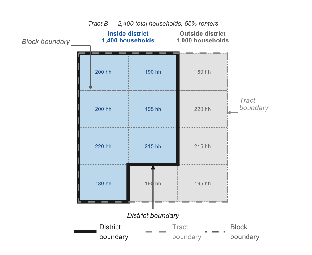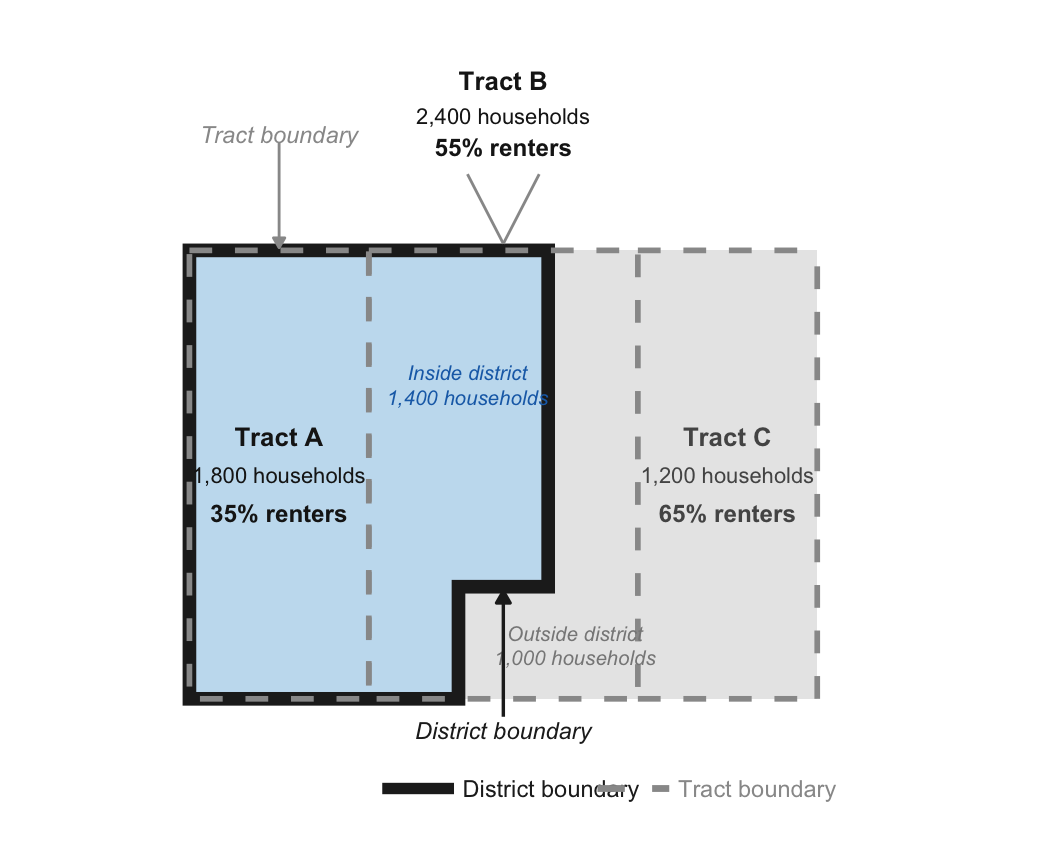 For example, the district boundary below fully encompasses Tract A, but is only partially inside Tract B. When calculating the district’s rental share, we only know that 35% of residents of Tract A are renters and 55% of residents of Tract B are renters—we don’t know the specific fraction of renters in the portion of Tract B inside the district. However, we do know how much of the population of Tract B is inside vs. outside the district. We account for this by weighting tract B’s renter share by population of tract B inside the district (1,400 households), rather than its full population (2,400 households).