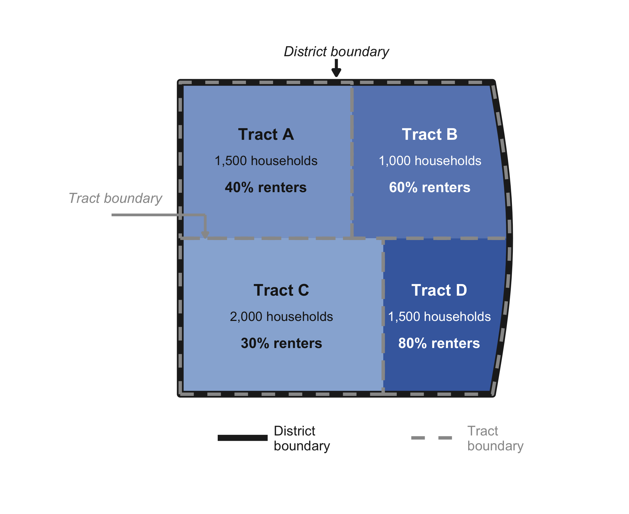 As a simple example, consider calculating the percentage of renter-occupied households in a district with four census tracts, each of which is fully within the district boundary: